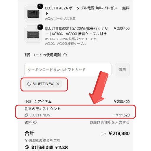 - ステップ①: まずはBLUETTI(ブルーティ)公式サイトでメルマガ登録5%OFFクーポン(BLUETTINEW)をGETして、欲しい商品(またはお得なセット品)をカートに入れる