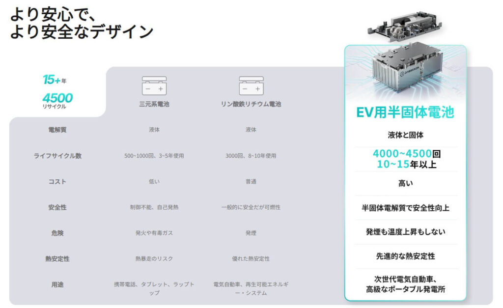Dabbsson(ダブソン)公式サイトに書いてある『半固体LiFePO4バッテリーを採用されており、より速く、より安全で、より長持ちする電力を供給す。』ってこの言葉は、他の有名メーカーと何が違うの?