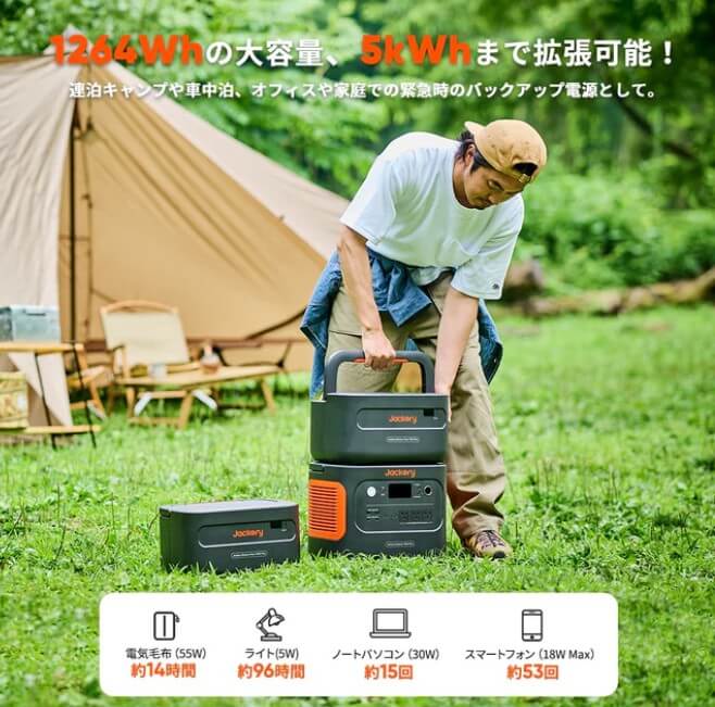 1,264Wh(本体のみ)だと、2日目の夜には節電を気なりはじめる…でも拡張バッテリーで2,528Wh以上に容量を増やしておけば、最終日までスマホもPCも、調理家電もフル活用できます!